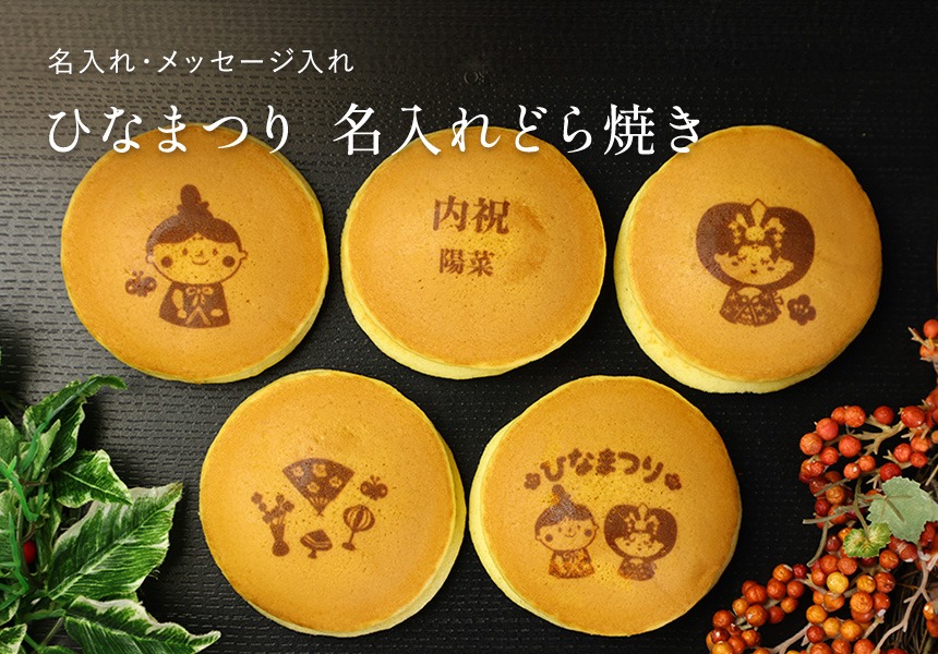 桃の節句のお祝い、贈り物に。 おひな様やお内裏様のイラストに加え、どら焼きにお名前やメッセージをお入れした季節限定の商品です。 食品用のインクで文字を印刷する技術で、どら焼きの生地の上に文字や絵をプリントしています。 お名前が入れられる名入れどら焼きは、その人のためだけに作られる、特別な贈り物。お子様、お孫様の健やかな成長を祝うひなまつりの贈り物にぴったりなお菓子です。 |