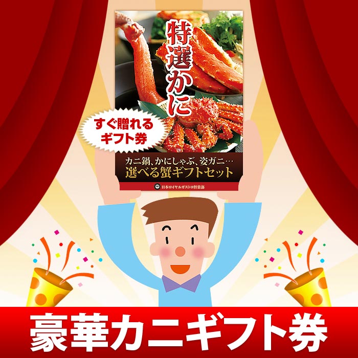 日本ロイヤルガストロ倶楽部が厳選するカニ(蟹)の「選べる」グルメギフト券(グルメギフトカード)です。送り先様には、ギフト券に同封されているカタログの中からお好きなカニのギフトセットをお選びいただけます。タラバガニやズワイガニの「かにしゃぶ」「カニ脚」「姿がに」など、おいしいカニギフトをご用意しております。