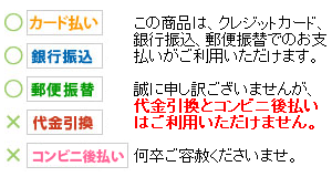 | クレジットカード・銀行振込・郵便振替がご利用いただけます。 ■銀行振込・郵便振替をご利用の場合は、ご入金確認後の商品発送となります。お急ぎの方は、クレジットカード決済か代金引換をご利用くださいませ。 ■クレジットーカード決済をお選びいただいた方で、カードエラー等で決済が正常にお取りできなかった場合は、他のお支払い方法へのご変更をお願いさせていただく場合もございます。 ■誠に申し訳ございません。頒布会は、代金引換のご利用をご容赦いただいております。 |