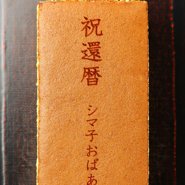 こちらは還暦のお祝い用に「祝 還暦」の文字が入っている名入れカステラです。