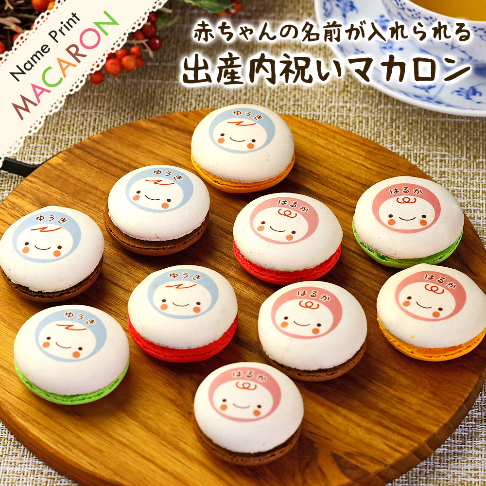 コロッと丸い形に、ホロッと食感の生地。甘くておいしいクリームがたっぷり入ったフランス生まれの洋菓子マカロンに、かわいい赤ちゃんのイラストと「お名前」をカラーでプリント!
