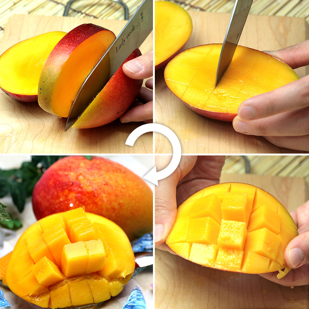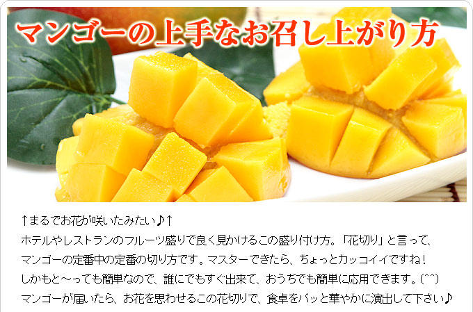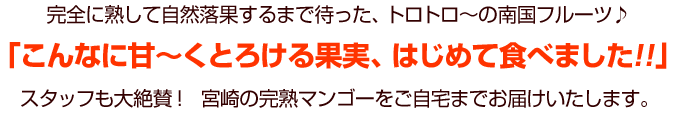 フルーツを超えた果物… それが宮崎の完熟マンゴーです! 箱を空けた瞬間、ふわっと立ち昇る南国フルーツ特有の甘い香りが部屋中に漂います。 早く食べたい気持ちを抑えてナイフを入れれば、皮は薄く、中はとろっとろ~♪♪ 待ちきれずにパクッ!と頬張れば、あふれ出る果汁の瑞々しさと甘みがお口の中いっぱいに広がります。 この感動の味は、 二度と忘れることができません!! 太陽の恵みを濃縮した、人生一度は味わいたいフルーツ♪ 完熟マンゴーの美味しさを皆様の下へお届けいたします。 |