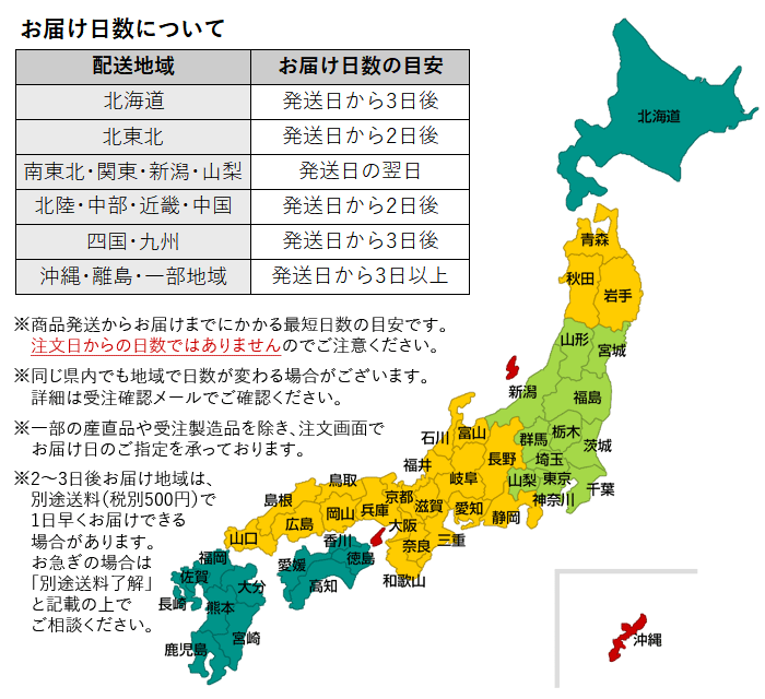 お届け日の目安が2日後・3日後お届けの地域で、お届け日を本来の予定日よりも1日早くしたい場合は、別途料金(税別500円)で変更可能な場合があります。ご希望の場合は、『別途送料了解。』と記載の上で、お問合せくださいませ。